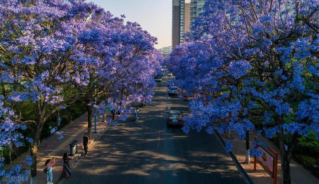 4月中下旬,昆明蓝花楹怒放经过已达90%,这技巧来刚好能看到满街紫雾缭绕的绝好意思征象。